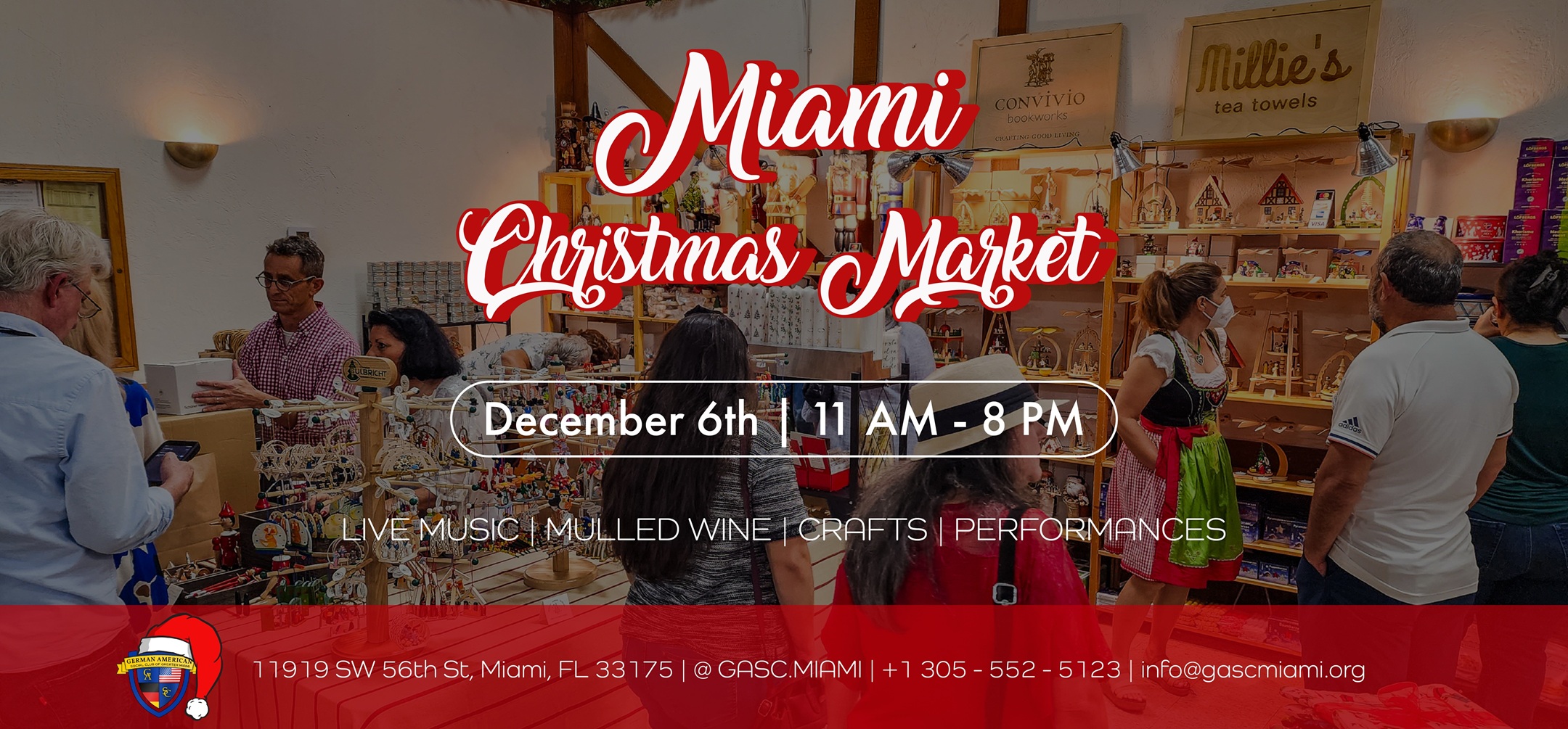 MIAMI, FL, UNITED STATES, December 2, 2025 /EINPresswire.com/ -- Christmas Market Miami returns this Saturday as the city’s largest and most authentic holiday market, bringing more than 100 confirmed vendors, live entertainment, and family-friendly activities to the German American Social Club of Greater Miami (GASC). The annual event, organized by the nonprofit GASC, opens December 6 from 11 a.m. to 8 p.m. with free admission for all visitors.