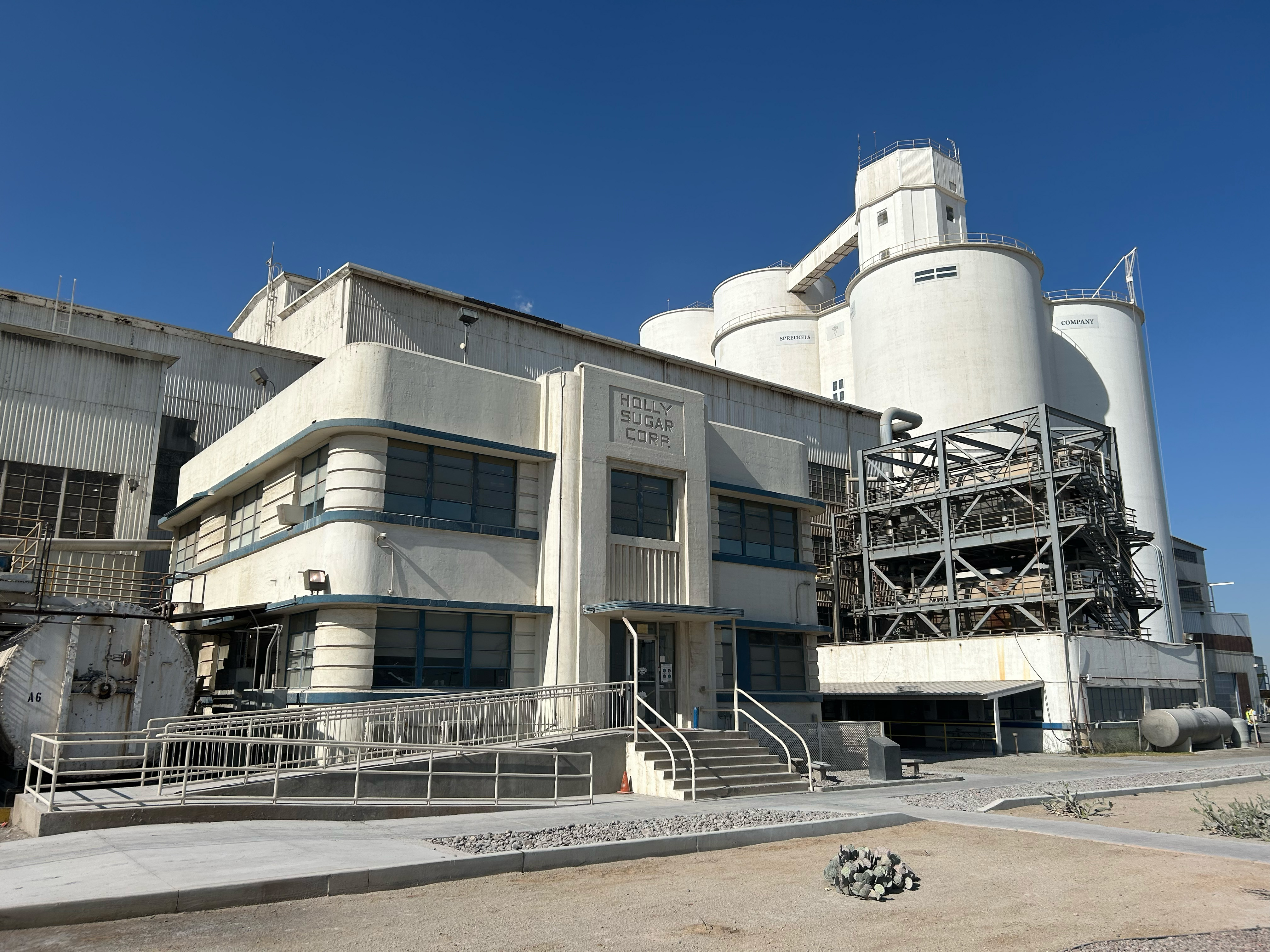 Wide photo showing street facing view of the beet sugar facility recently closed in Brawley, California. Assets are available for sale on Aucto marketplace